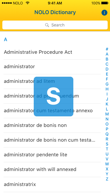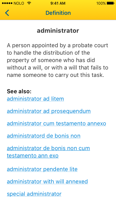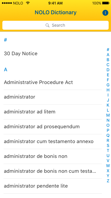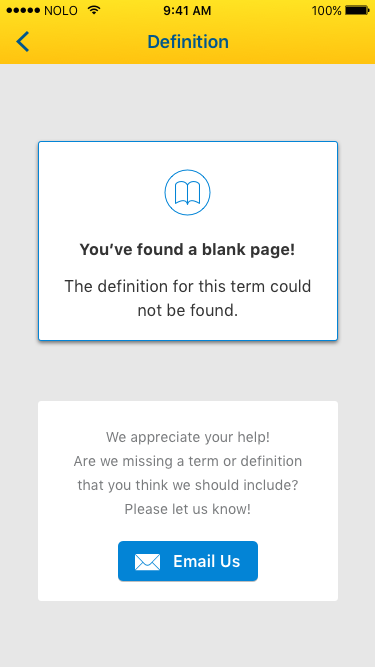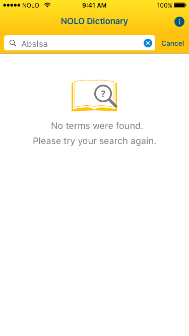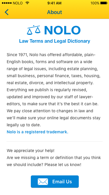 I completed the screen redesigns within the week allotted. It was then successfully developed and released in time to continue being available in the app store. Additionally, I designed all assets including the Nolo Dictionary logo, icon, and app store visuals.