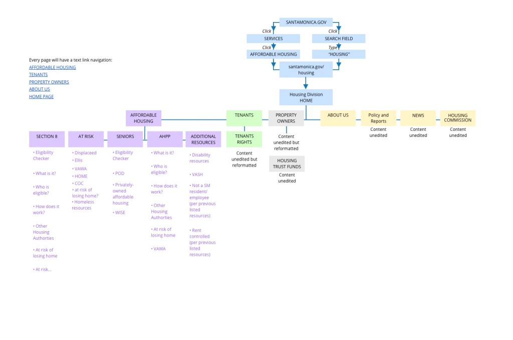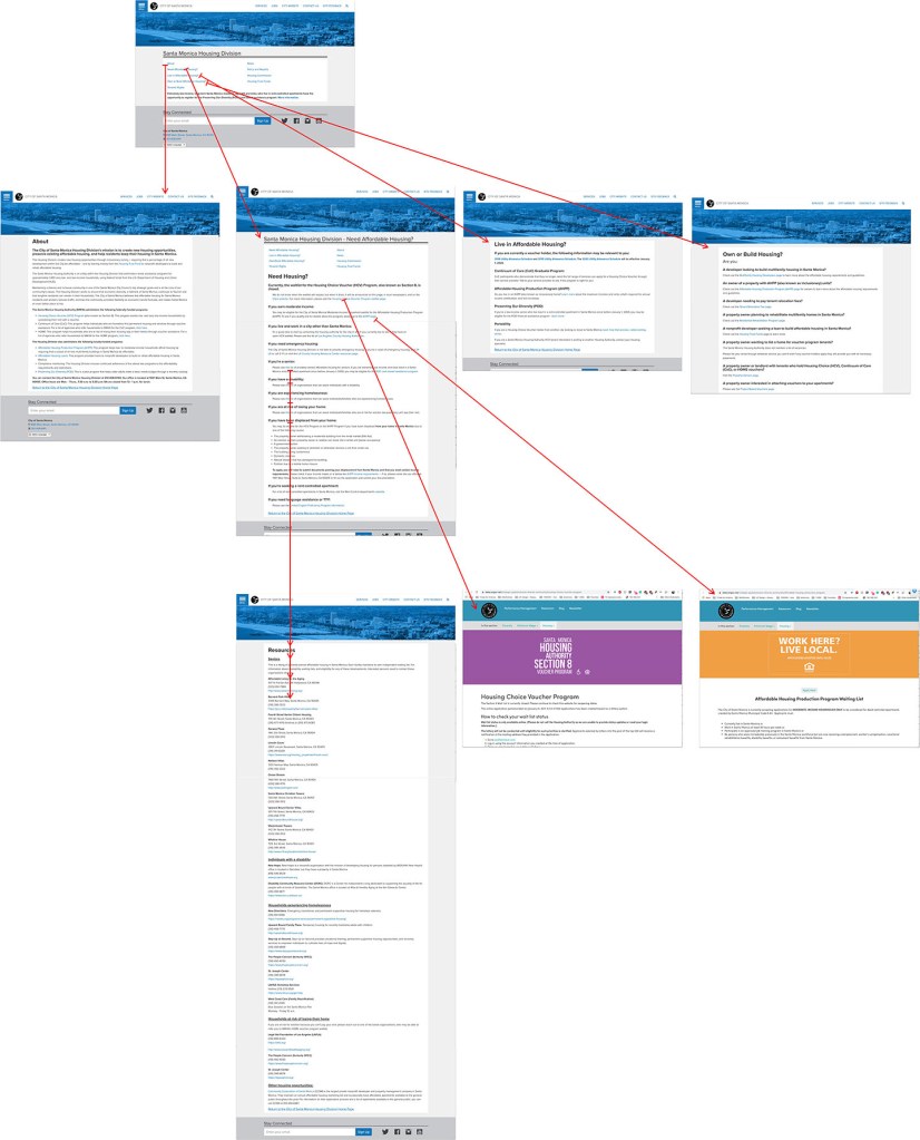 - I added a ‘main’ navigation table to connect the main housing division pages to each other, allowing users to browse all of the SMHA content. A big issue with the website is that the Housing Division website exists as a page on the city’s website. Adding to the difficulty of not having a dedicated URL, the city of Santa Monica had flattened their entire website, eliminating all department/division pages. This was not conducive to browsing the site to look for information. A visitor using the site would need to know exactly what they were looking for, or what keywords to search, to find information. Thus, it’s easy to get lost on the website, especially since the Housing Division’s subpages were not linked to one another, discoverable most easily from the main search field on santamonica.gov.