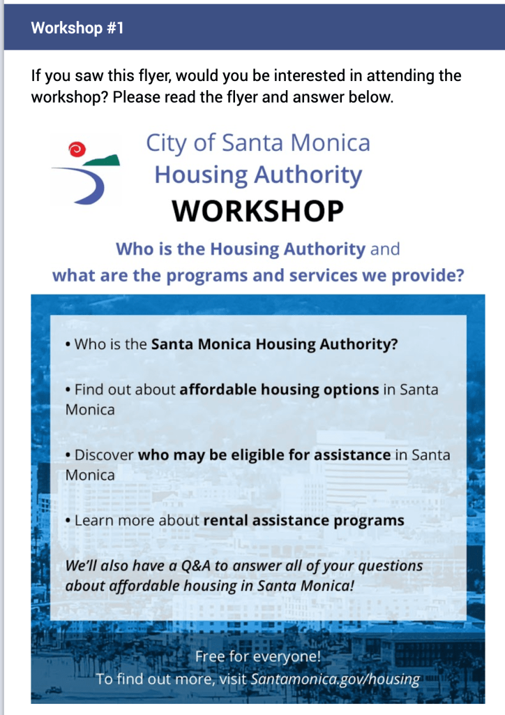 “…it definitely seems so far like we are getting a much better ratio of local/not local applicants this time around. The quiz and your insights in to what the public does/doesn’t know about housing in SM were both helpful in planning the opening [of the Section 8 waitlist].“