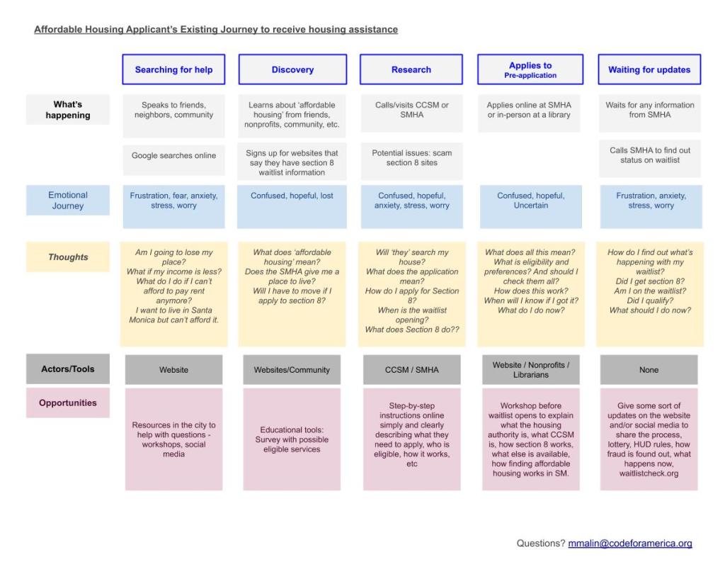 As a Code for America community fellow, I worked with the City of Santa Monica’s Housing Authority (SMHA) to improve the affordable housing application process. SMHA’s manager had been looking for some way to improve the overall process and was considering technological solutions.