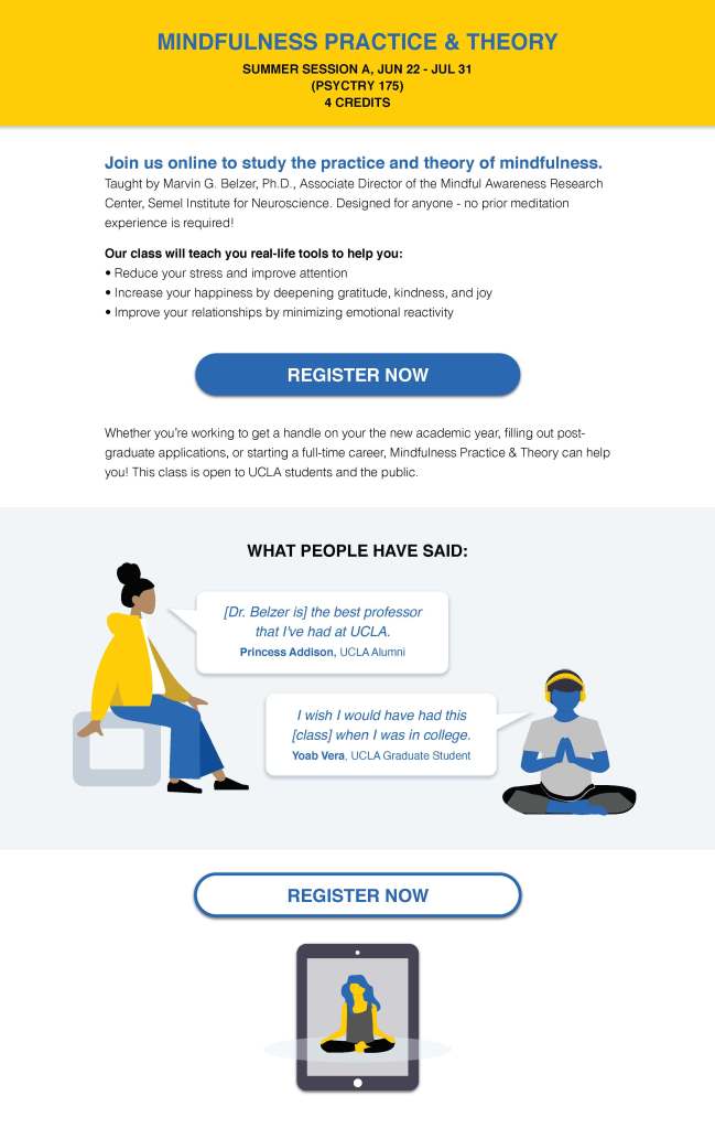 Last year I was enrolled in the Intensive Practice Program at the Mindfulness Awareness Research Center (MARC) at UCLA. As part of the program I took several MAPs courses and attended a lot of daylong retreats. They would like to market a new summer course to the UCLA students. As part of the marketing plan they forwarded me a first draft email that looked like the left image. The email draft on the right shows my visual and copy edits.